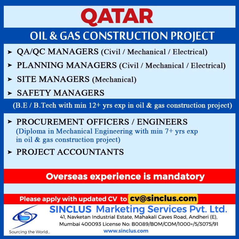 QATAROIL & GAS CONSTRUCTIONPROJECT➤ QA/QC MANAGERS (Civil / Mechanical / Electrical)➤ PLANNING MANAGERS (Civil / Mechanical / Electrical)➤ SITE MANAGERS …
