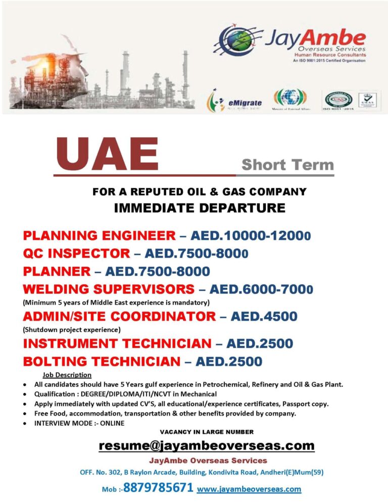 FOR A REPUTED OIL & GAS COMPANYIMMEDIATE DEPARTUREShort TermPLANNING ENGINEER – AED.10000-12000QC INSPECTOR – AED.7500-8000PLANNER – AED.7500-8000WELDING SUPERVISORS – AED.6000-7000(Minimum …