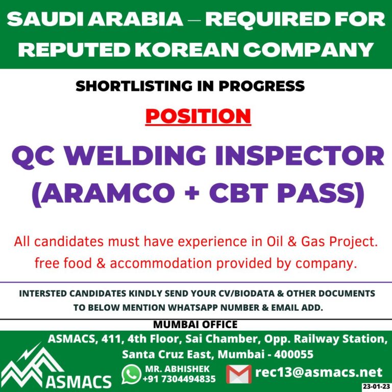 SAUDI ARABIA – REQUIRED FORREPUTED KOREAN COMPANYSHORTLISTING IN PROGRESSPOSITIONQC WELDING INSPECTOR(ARAMCO + CBT PASS)All candidates must have experience in Oil …