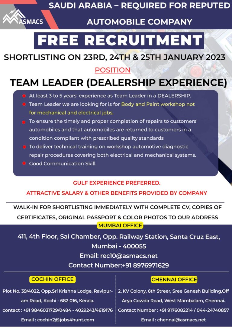 SAUDI ARABIA – REQUIRED FOR REPUTEDAUTOMOBILE COMPANYFREE RECRUITMENTSHORTLISTING ON 23RD, 24TH & 25TH JANUARY 2023POSITIONTEAM LEADER (DEALERSHIP EXPERIENCE)At least 3 …