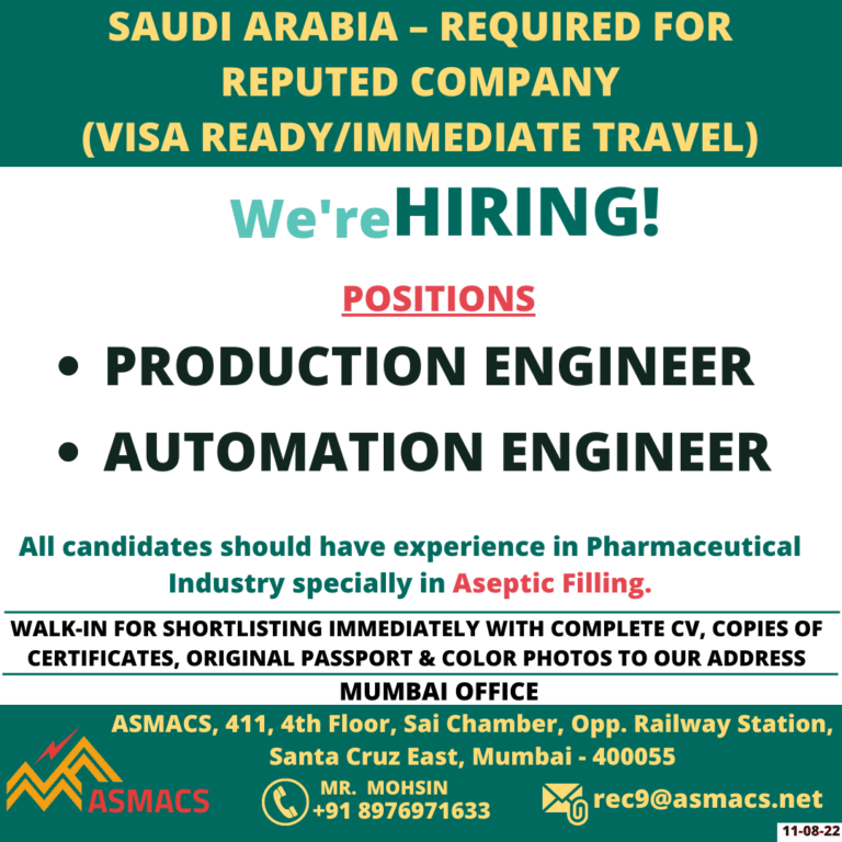 SAUDI ARABIA – REQUIRED FORREPUTED COMPANY(VISA READY/IMMEDIATE TRAVEL)HIRING!We’rePOSITIONSPRODUCTION ENGINEERAUTOMATION ENGINEERAll candidates should have experience in PharmaceuticalIndustry specially in Aseptic Filling.WALK-IN …