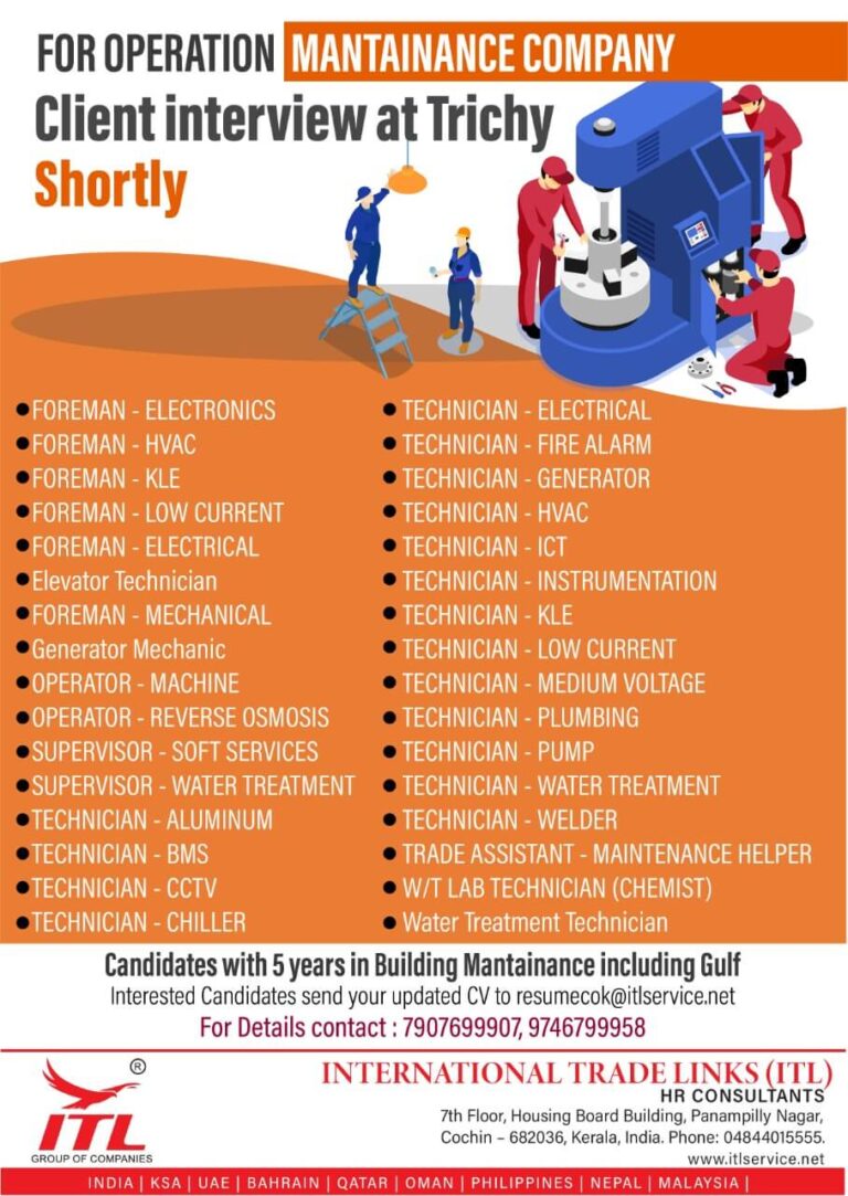 FOR OPERATION MAINTENANCE COMPANY Client interview at Trichy Shortly. FOREMAN – ELECTRONICS• TECHNICIAN – ELECTRICAL FOREMAN – HVACTECHNICIAN – FIRE …