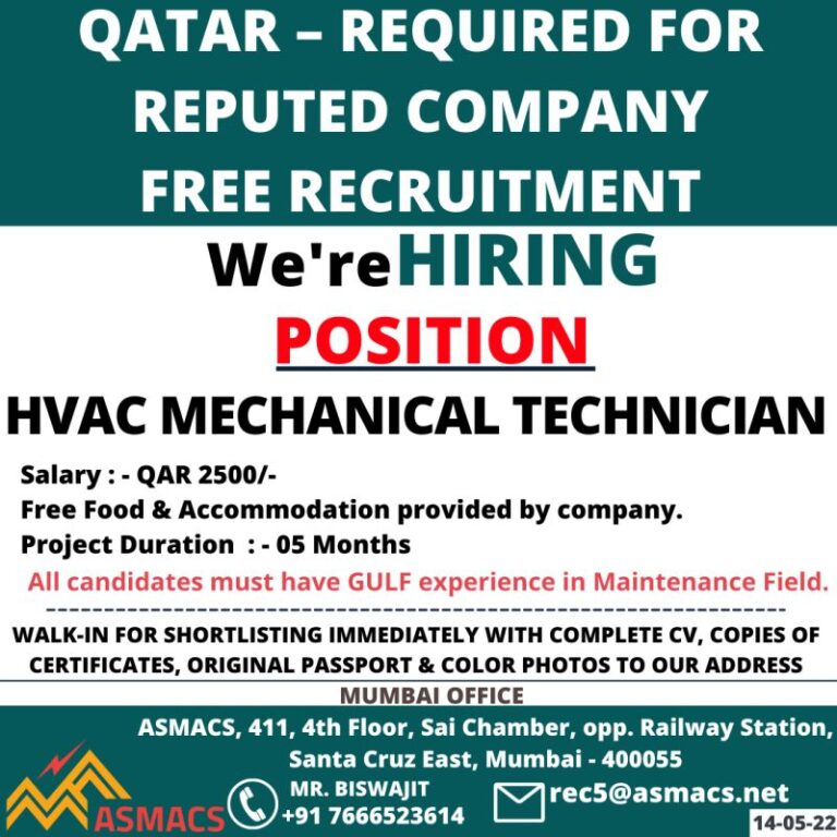 QATAR – REQUIRED FORREPUTED COMPANYFREE RECRUITMENTHIRINGWe’rePOSITIONHVAC MECHANICAL TECHNICIANSalary : – QAR 2500/-Free Food & Accommodation provided by company.Project Duration : …