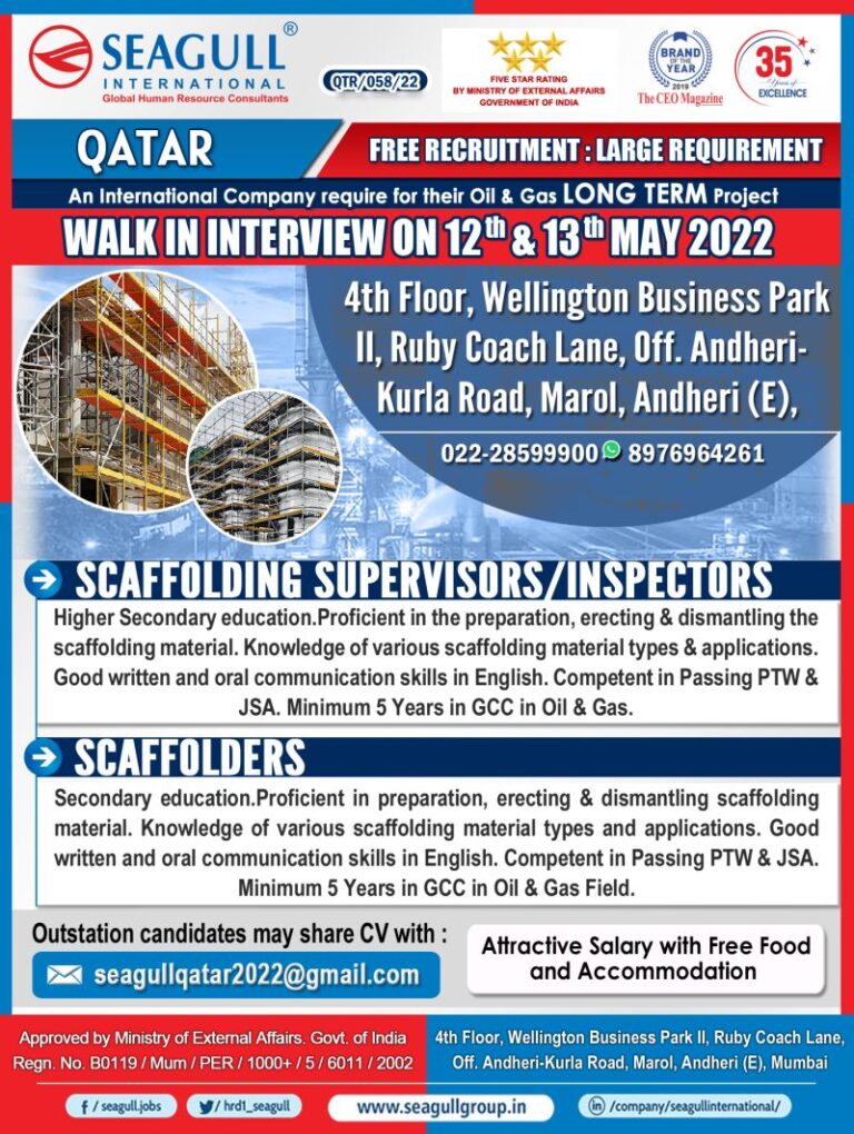 QATARFREE RECRUITMENT : LARGE REQUIREMENTAn International Company require for their Oil & Gas LONG TERM ProjectWALK IN INTERVIEW ON 12 …