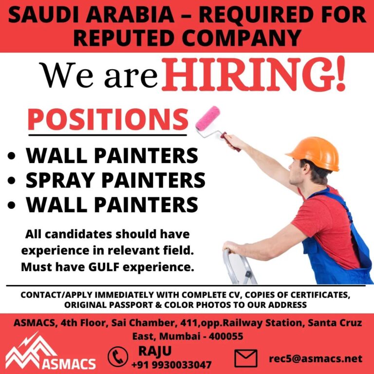 SAUDI ARABIA – REQUIRED FORREPUTED COMPANYWe are HIRING!POSITIONS• WALL PAINTERS• SPRAY PAINTERS• WALL PAINTERSAll candidates should haveexperience in relevant field.Must …