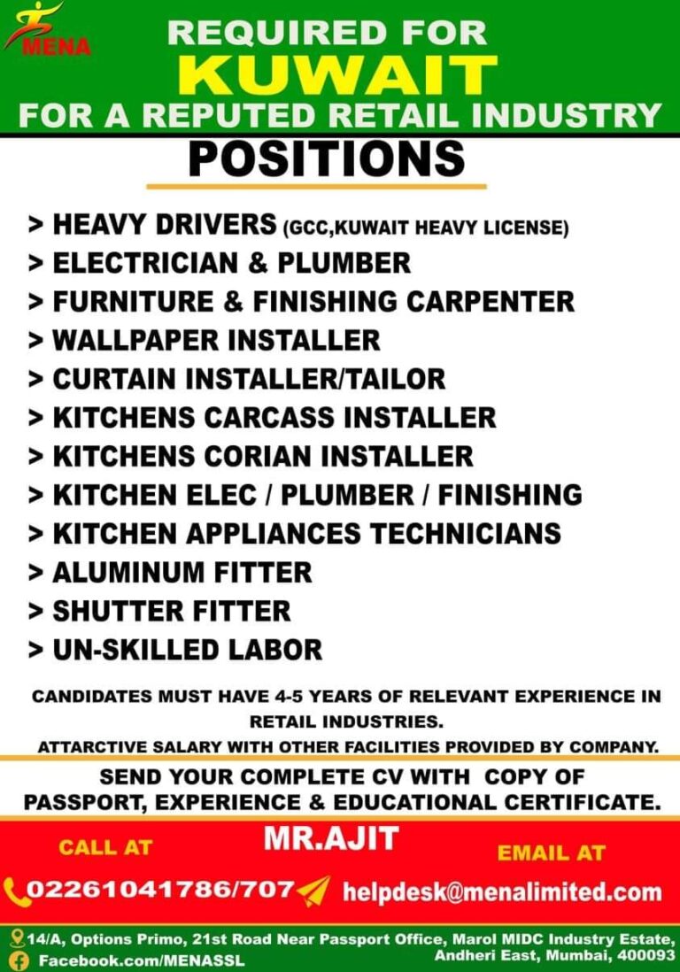 REQUIRED FORMENA KUWAITFOR A REPUTED RETAIL INDUSTRYPOSITIONS HEAVY DRIVERS (GCC,KUWAIT HEAVY LICENSE)ELECTRICIAN & PLUMBERFURNITURE & FINISHING CARPENTERWALLPAPER INSTALLERCURTAIN INSTALLER/TAILORKITCHENS CARCASS …