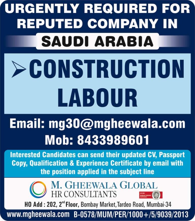 URGENTLY REQUIRED FORREPUTED COMPANY INSAUDI ARABIACONSTRUCTIONLABOUREmail: mg30@mgheewala.comMob: 8433989601Interested candidates can send their updated CV, PassportCopy, Qualification & Experience Certificate by …