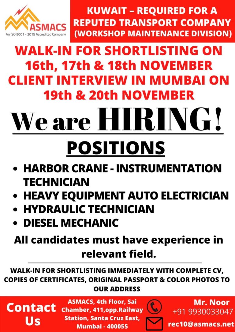 KUWAIT – REQUIRED FOR AREPUTED TRANSPORT COMPANYASMACS(WORKSHOP MAINTENANCE DIVISION)WALK-IN FOR SHORTLISTING ON16th, 17th & 18th NOVEMBERCLIENT INTERVIEW IN MUMBAI ON19th …