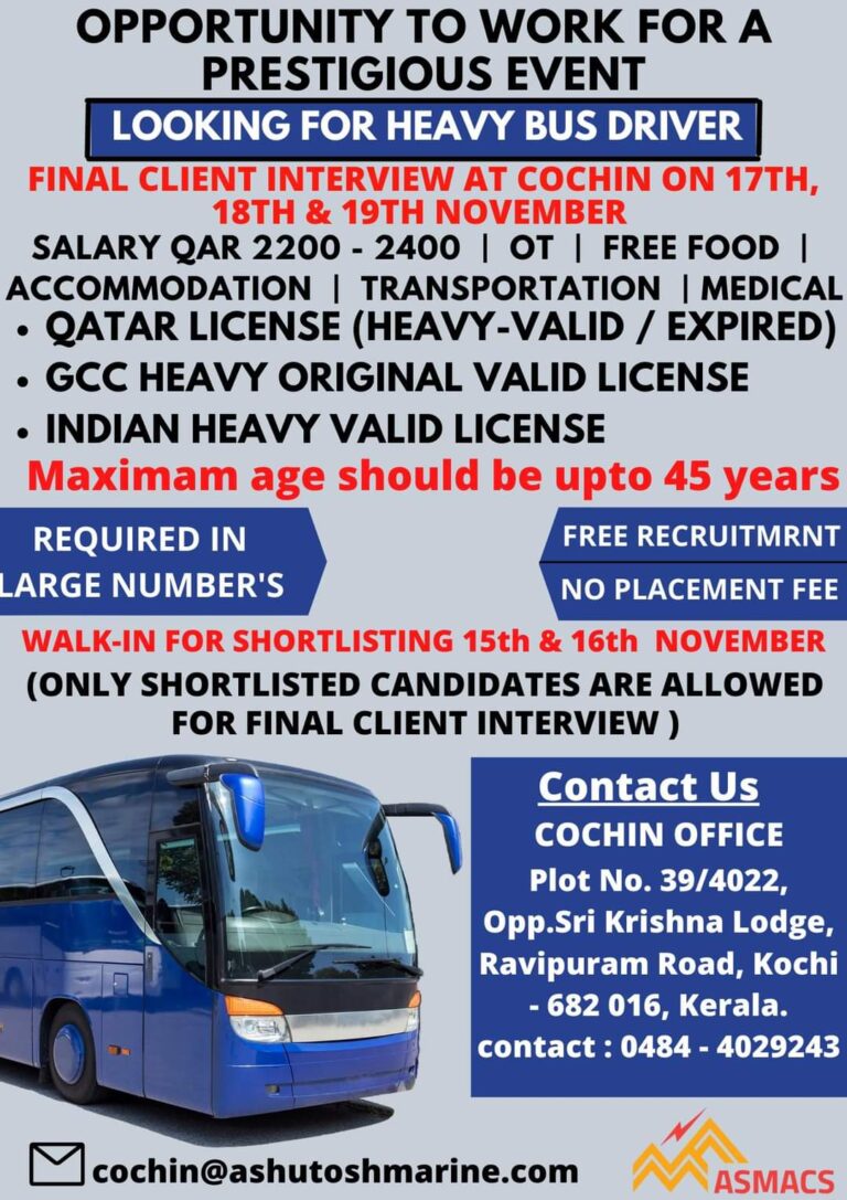 OPPORTUNITY TO WORK FOR APRESTIGIOUS EVENTLOOKING FOR HEAVY BUS DRIVERFINAL CLIENT INTERVIEW AT COCHIN ON 17TH,18TH & 19TH NOVEMBERSALARY QAR …