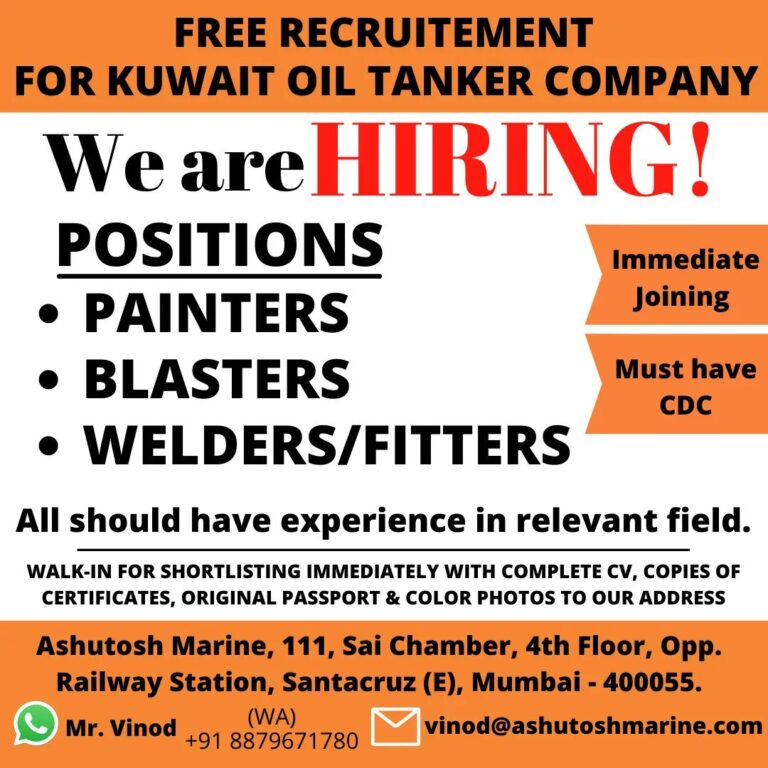 FREE RECRUITMENTFOR KUWAIT OIL TANKER COMPANYPOSITIONS• PAINTERS• BLASTERS• WELDERS/FITTERSImmediateJoiningMust haveCDCAll should have experience in relevant field.WALK-IN FOR SHORTLISTING IMMEDIATELY WITH …