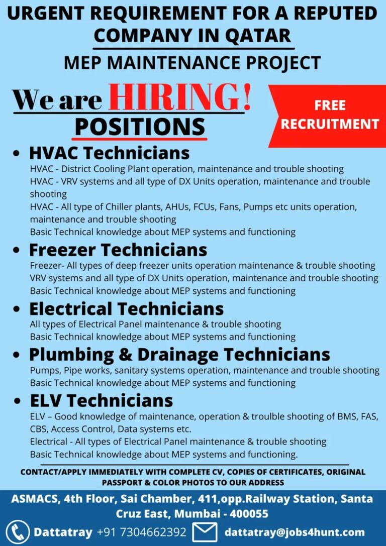 URGENT REQUIREMENT FOR A REPUTEDCOMPANY IN QATARMEP MAINTENANCE PROJECT• HVAC TechniciansHVAC – District Cooling Plant operation, maintenance and trouble shootingHVAC …