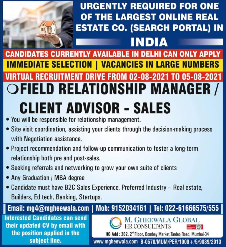 URGENTLY REQUIRED FOR ONEOF THE LARGEST ONLINE REALESTATE CO. (SEARCH PORTAL) IN INDIACANDIDATES CURRENTLY AVAILABLE IN DELHI CAN ONLY APPLYIMMEDIATE …