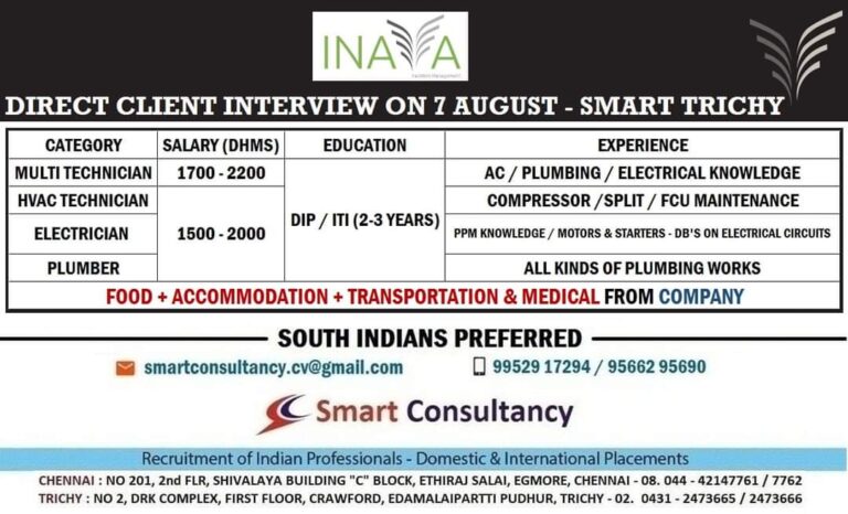 INAVA.DIRECT CLIENT INTERVIEW ON 7 AUGUST – SMART TRICHYCATEGORYEDUCATIONSALARY (DHMS)1700 – 2200MULTI TECHNICIANEXPERIENCEAC / PLUMBING / ELECTRICAL KNOWLEDGECOMPRESSOR /SPLIT / …