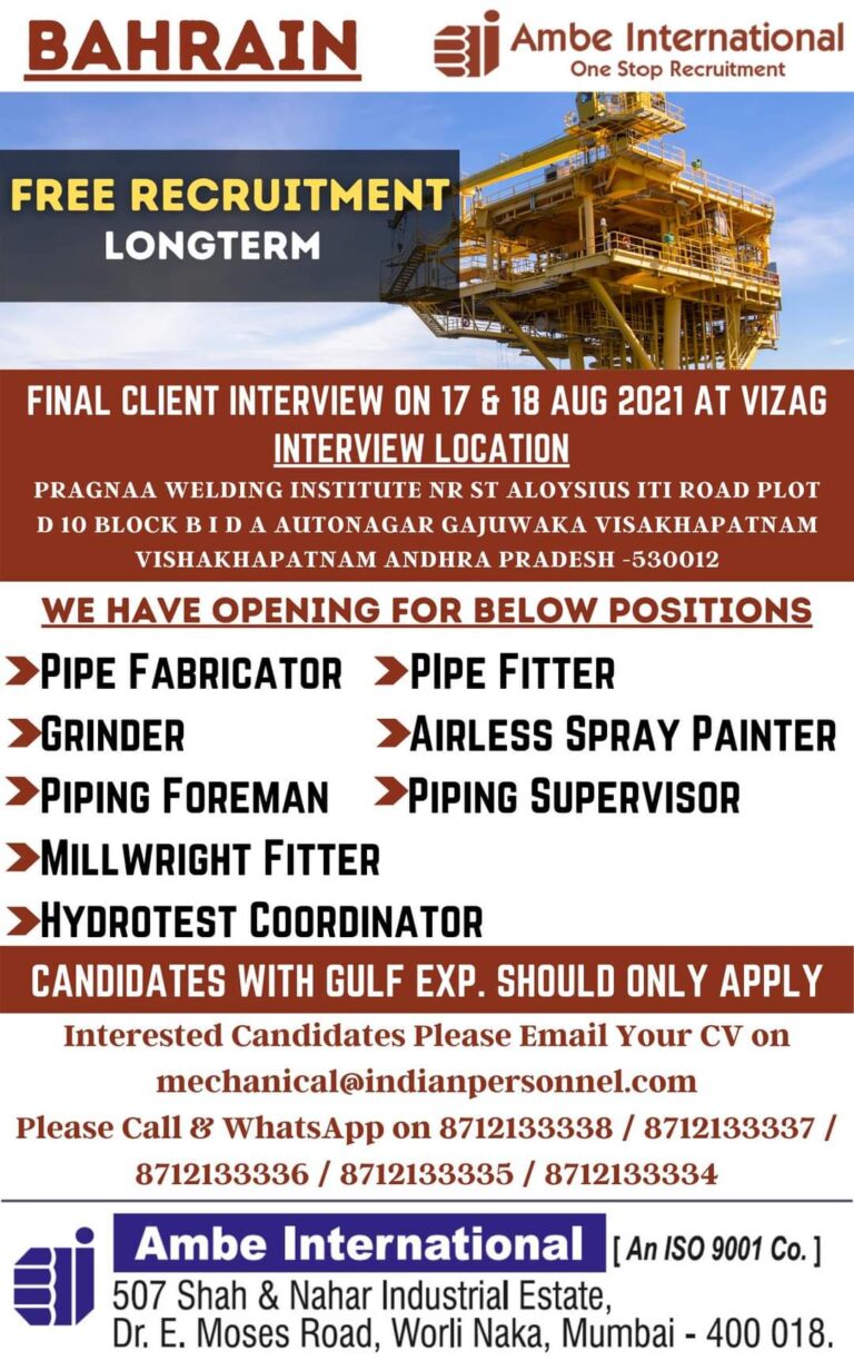 FREE RECRUITMENTFINAL CLIENT INTERVIEW ON 17 & 18 AUG 2021 AT VIZAGINTERVIEW LOCATIONPIPE FABRICATOR > PIPE FITTERGRINDERAIRLESS SPRAY PAINTERPIPING FOREMAN …