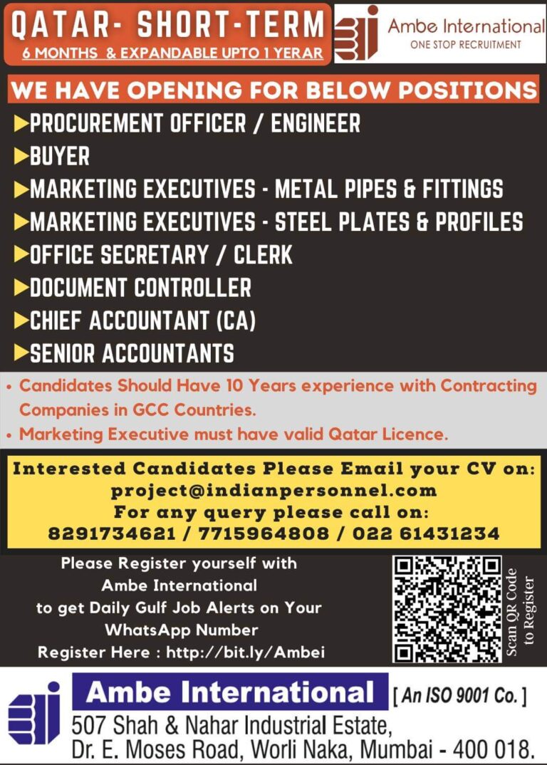QATAR- SHORT-TERMONE STOP RECRUITMENT6 MONTHS & EXPANDABLE UPTO 1 YERARWE HAVE OPENING FOR BELOW POSITIONSPROCUREMENT OFFICER / ENGINEERBUYERMARKETING EXECUTIVES – …