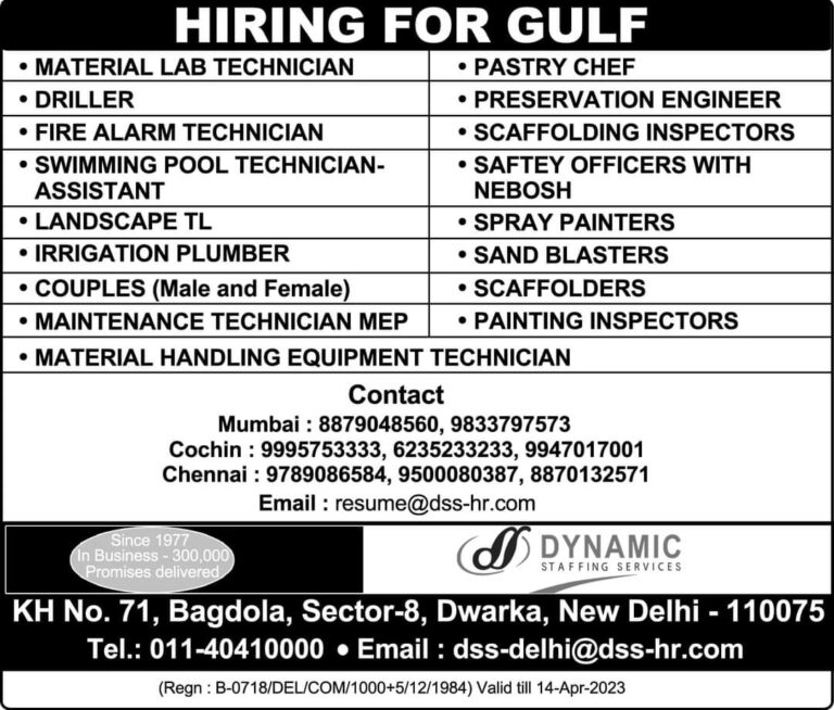 HIRING FOR GULF• MATERIAL LAB TECHNICIAN• PASTRY CHEF• DRILLER• PRESERVATION ENGINEER• SCAFFOLDING INSPECTORS.• FIRE ALARM TECHNICIANSWIMMING POOL TECHNICIAN-ASSISTANTLANDSCAPE TLIRRIGATION PLUMBER• …