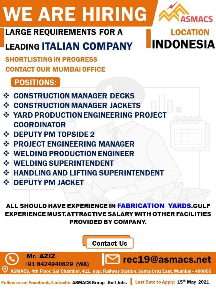LARGE REQUIREMENTS FOR ALOCATIONLEADING ITALIAN COMPANY INDONESIASHORTLISTING IN PROGRESSCONTACT OUR MUMBAI OFFICEPOSITIONS:CONSTRUCTION MANAGER DECKSCONSTRUCTION MANAGER JACKETSYARD PRODUCTION ENGINEERING PROJECTCOORDINATORDEPUTY PM …