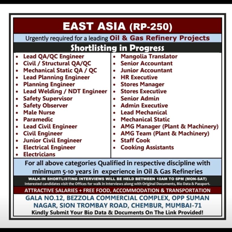 Urgently required for a leading Oil & Gas Refinery ProjectsShortlisting in ProgressLead QA/QC EngineerCivil / Structural QA/QCMechanical Static QA/ QCLead …
