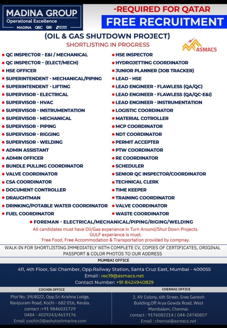 MADINA GROUPOperational ExcellenceMADINA QISC QIS SEVERN(OIL & GAS SHUTDOWN PROJECT)SHORTLISTING IN PROGRESS• QC INSPECTOR – E&I/MECHANICAL• QC INSPECTOR – (ELECT/MECH)• …