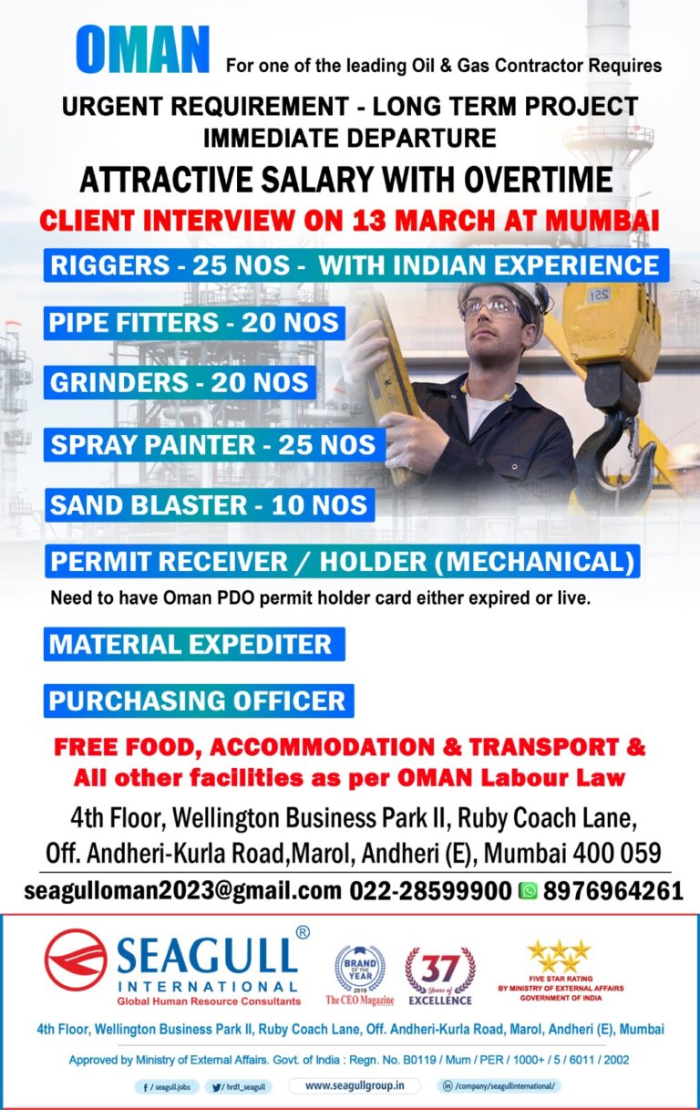 OMANFor one of the leading Oil & Gas Contractor RequiresURGENT REQUIREMENT – LONG TERM PROJECTIMMEDIATE DEPARTUREATTRACTIVE SALARY WITH OVERTIMECLIENT INTERVIEW …