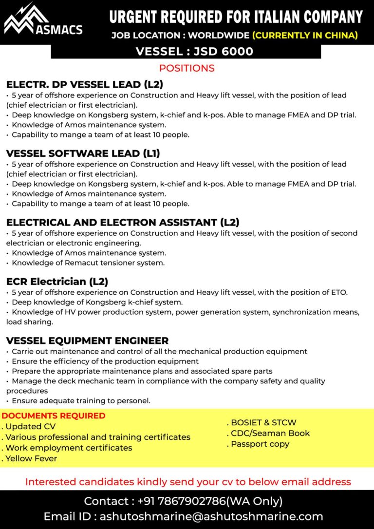 URGENT REQUIRED FOR ITALIAN COMPANYJOB LOCATION: WORLDWIDE (CURRENTLY IN CHINA) VESSEL: JSD 6000POSITIONSELECTR. DP VESSEL LEAD (L2)5 year of offshore …