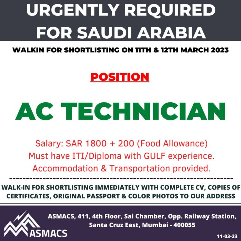 URGENTLY REQUIREDFOR SAUDI ARABIAWALKIN FOR SHORTLISTING ON 11TH & 12TH MARCH 2023POSITIONAC TECHNICIANSalary: SAR 1800+ 200 (Food Allowance) Must have …