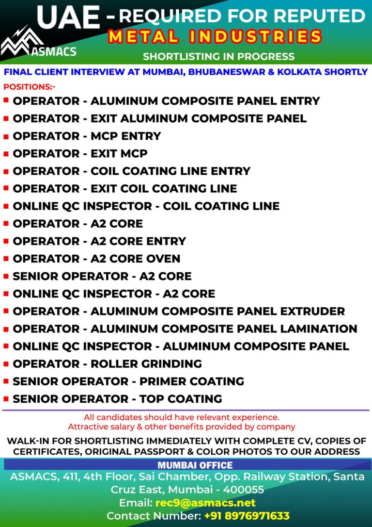 UAE – REQUIRED FOR REPUTEDMETAL INDUSTRIESSHORTLISTING IN PROGRESSFINAL CLIENT INTERVIEW AT MUMBAI, BHUBANESWAR & KOLKATA SHORTLYPOSITIONS:-■ OPERATOR – ALUMINUM COMPOSITE …
