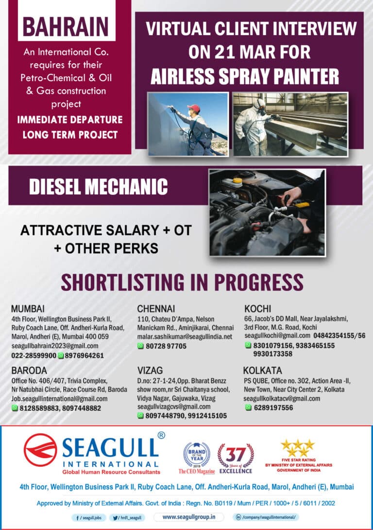 BAHRAINAn International Co.requires for theirPetro-Chemical & Oil& Gas constructionprojectIMMEDIATE DEPARTURELONG TERM PROJECTDIESEL MECHANICATTRACTIVE SALARY + OT