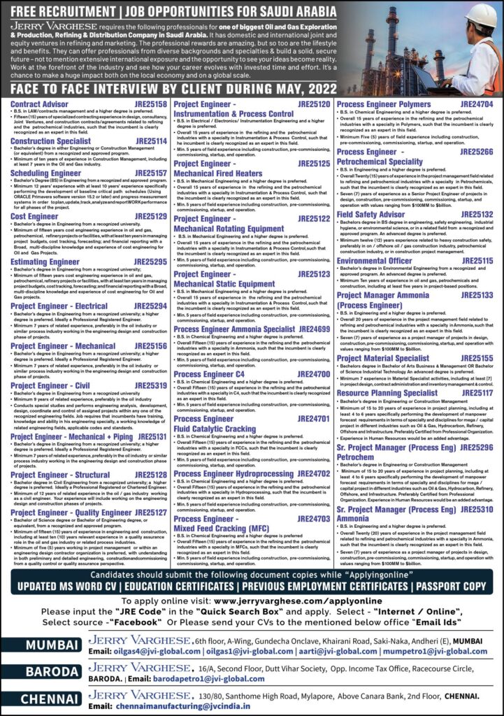 JERRY VARGHESE requires the following professionals for one of biggest Oil and Gas Exploration & Production, Refining & Distribution Company in Saudi Arabia. It has domestic and international joint and equity ventures in refining and marketing. The professional rewards are amazing, but so too are the lifestyle and benefits. They can offer professionals from diverse backgrounds and specialties & build a solid, secure future – not to mention extensive international exposure and the opportunity to see your ideas become reality. Work at the forefront of the industry and see how your career evolves with invested time and effort. It’s a chance to make a huge impact both on the local economy and on a global scale. FACE TO FACE INTERVIEW BY CLIENT DURING MAY. 2022 Contract Advisor JRE25158 Project Engineer –