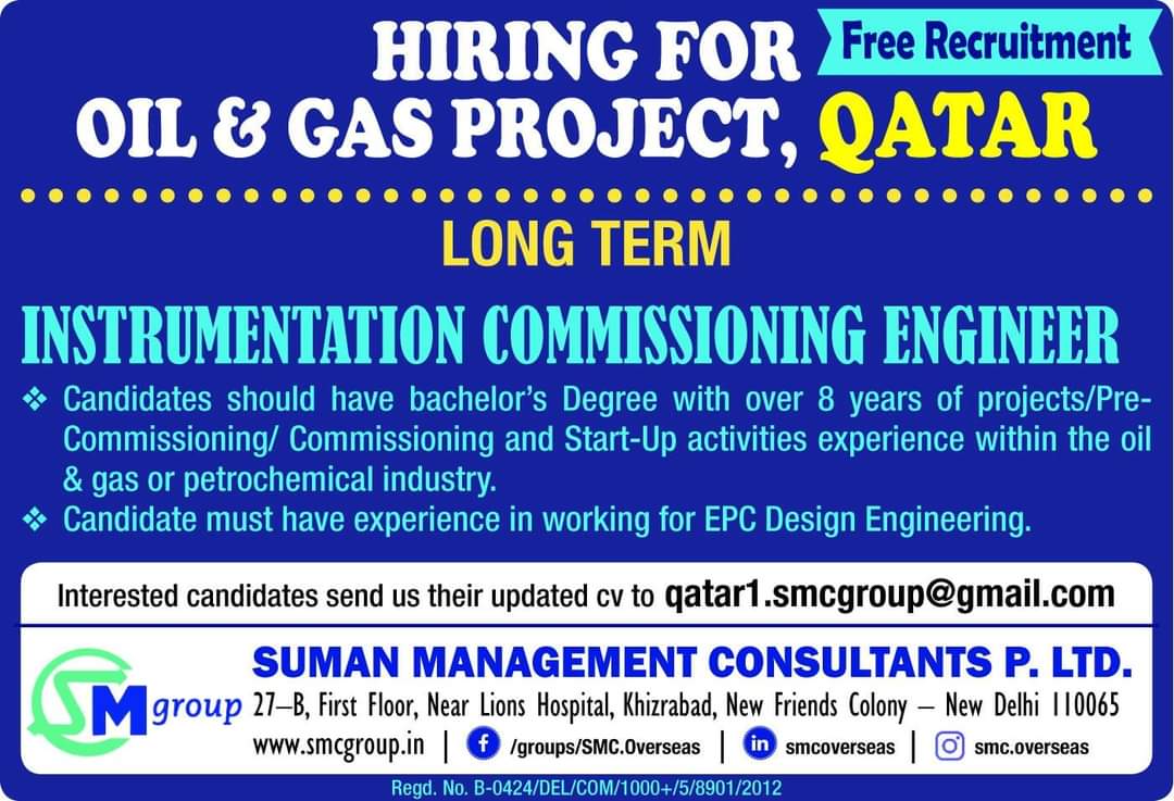 Interested candidates send us their updated cv to qatar1.smcgroup@gmail.com