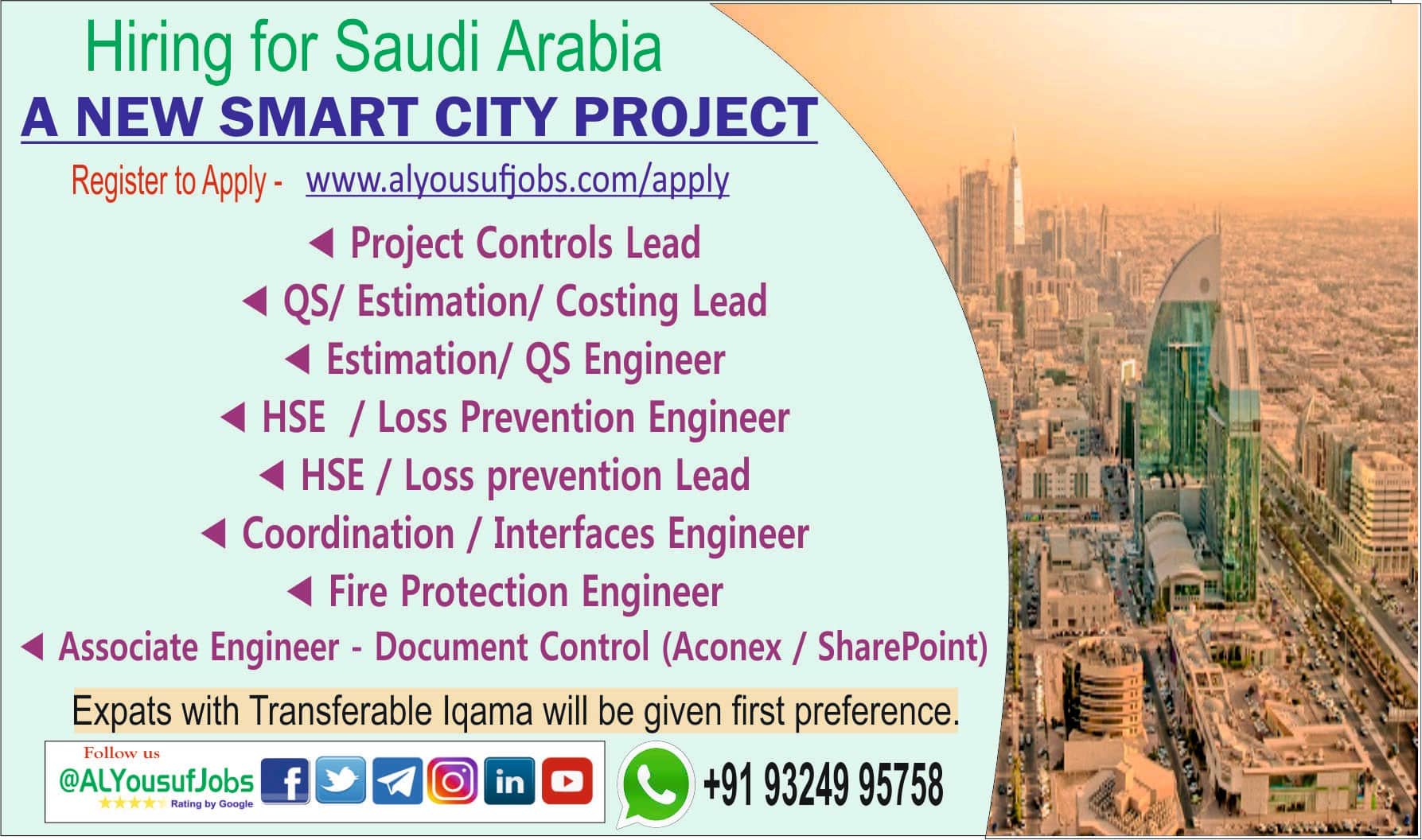 Expats with Transferable Iqama will be given first preference.