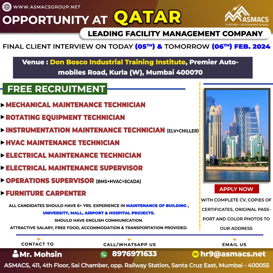 ALL CANDIDATES SHOULD HAVE 6+ YRS. EXPERIENCE IN MAINTENANCE OF BUILDING,