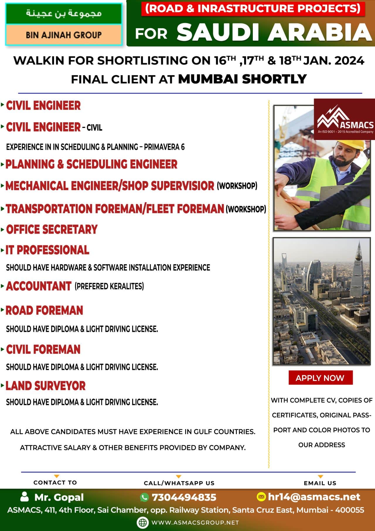 ALL ABOVE CANDIDATES MUST HAVE EXPERIENCE IN GULF COUNTRIES.