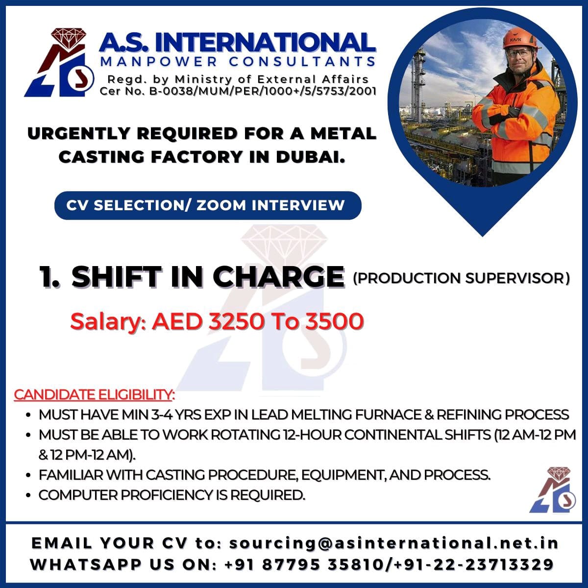EMAIL YOUR CV to: sourcing@asinternational.net.in