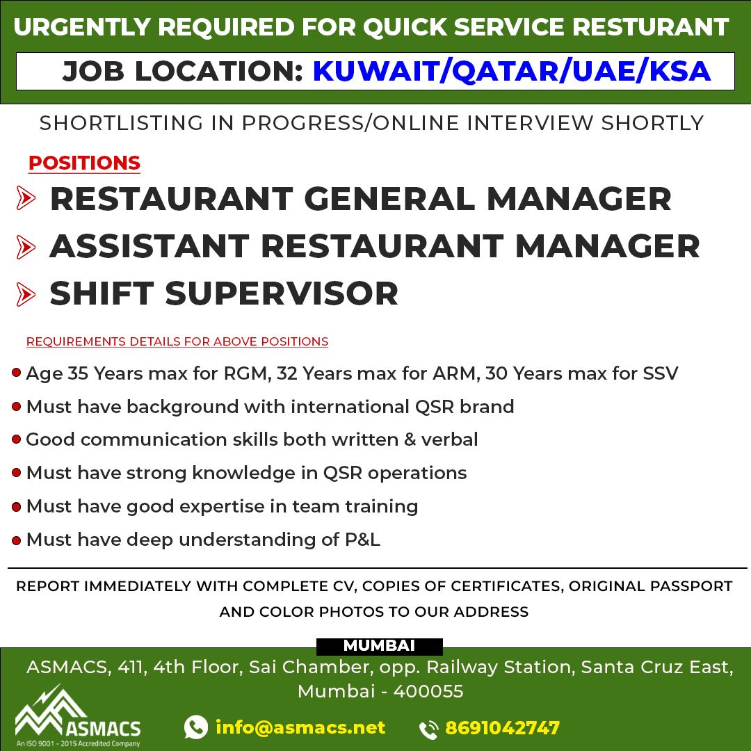 URGENTLY REQUIRED FOR QUICK SERVICE RESTURANT