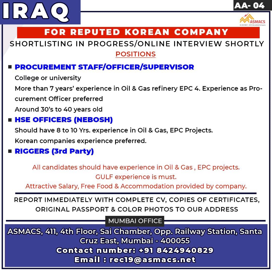 Should have 8 to 10 Yrs. experience in Oil & Gas, EPC Projects.