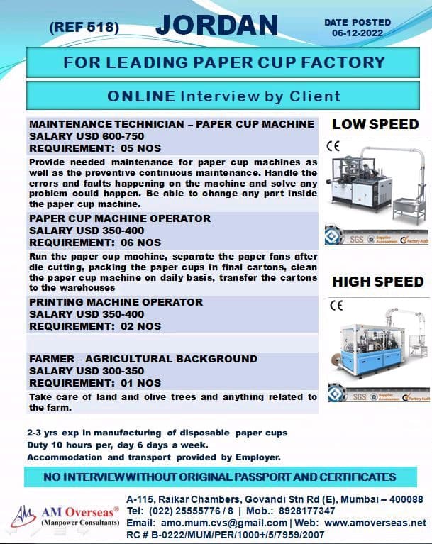 MAINTENANCE TECHNICIAN – PAPER CUP MACHINE LOW SPEED