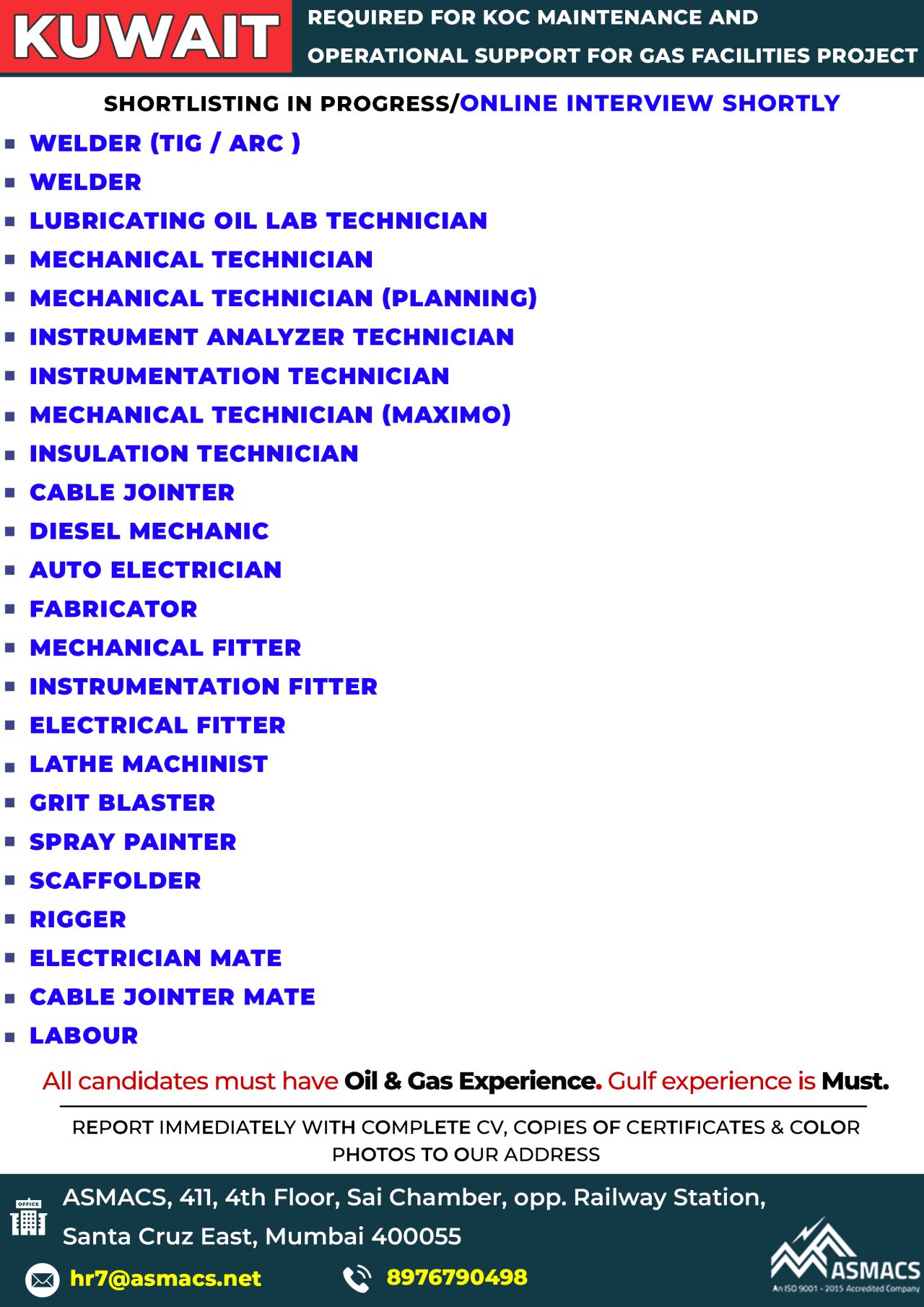 All candidates must have Oil & Gas Experience. Gulf experience is Must.