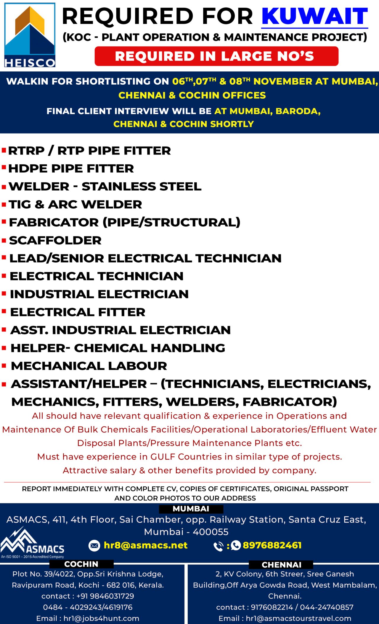 WALKIN FOR SHORTLISTING ON 06TH,07TH & 08TH NOVEMBER AT MUMBAI,
