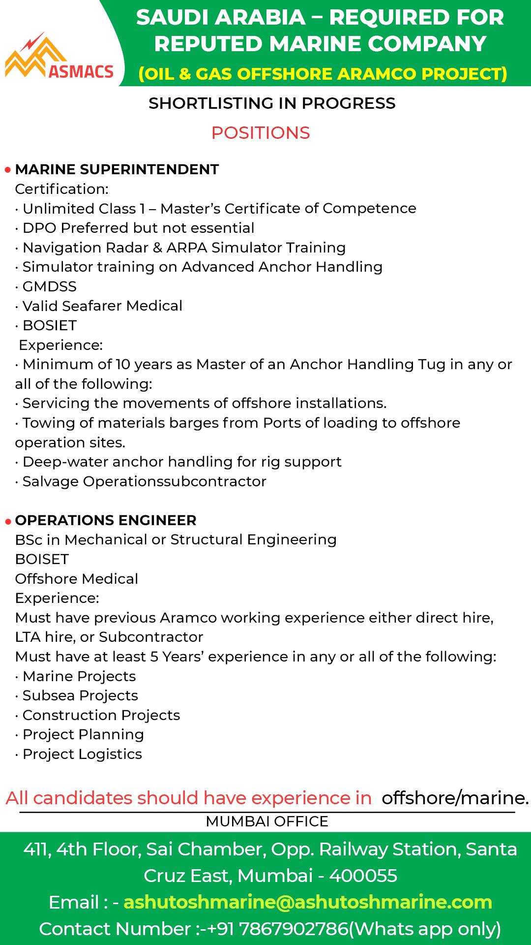 All candidates should have experience in offshore/marine.