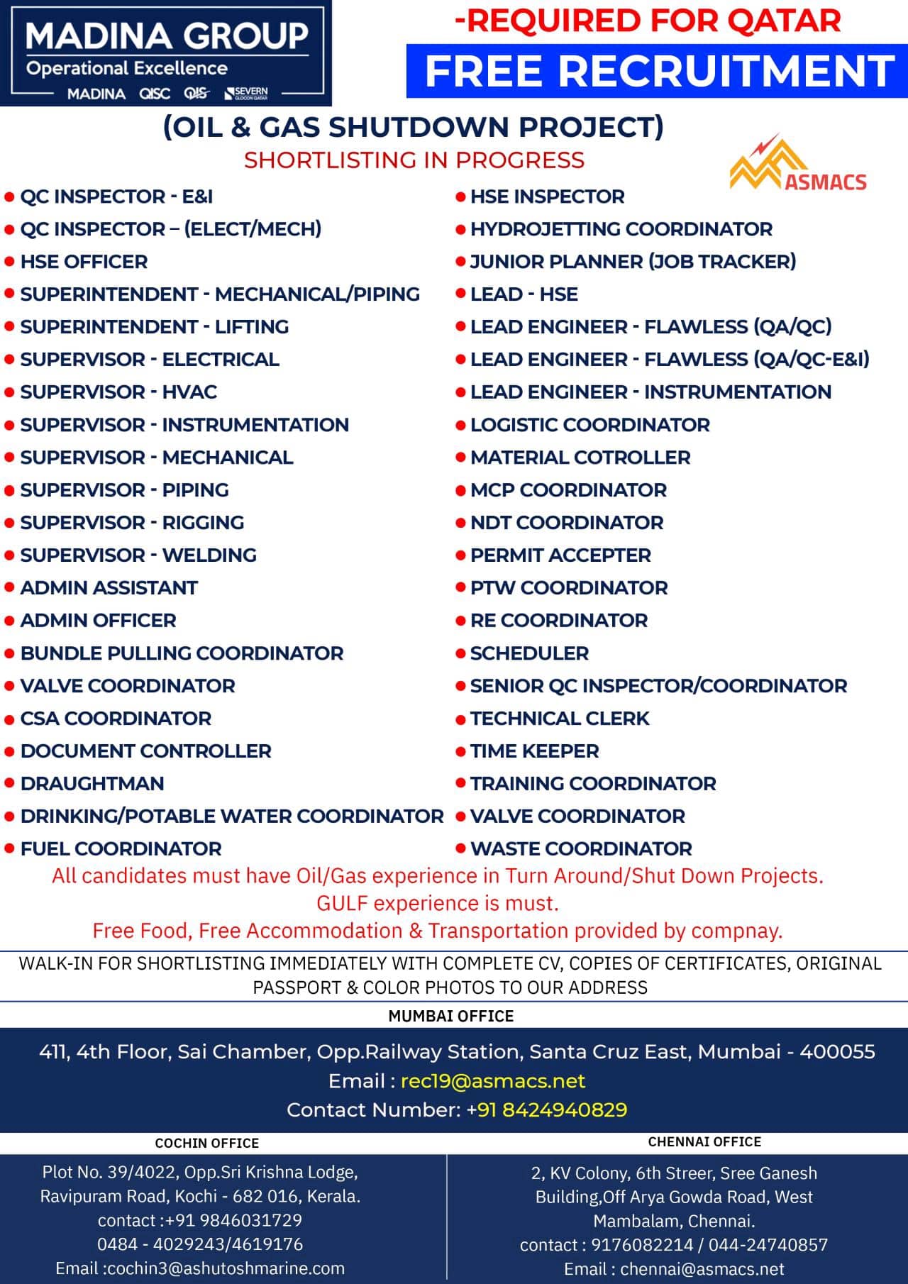 All candidates must have Oil/Gas experience in Turn Around/Shut Down Projects.