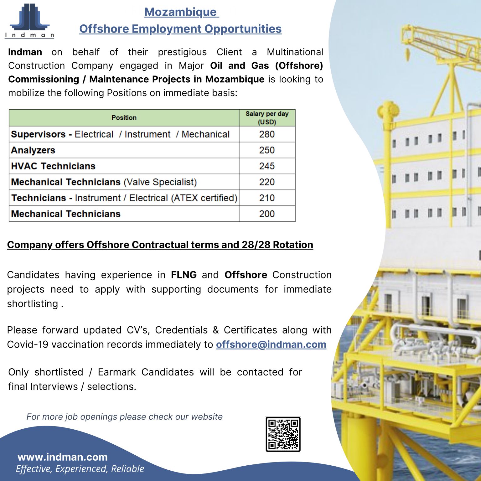 Indman on behalf of their prestigious Client a Multinational Construction Company engaged in Major Oil and Gas (Offshore) Commissioning / Maintenance Projects in Mozambique is looking to mobilize the following Positions on immediate basis: