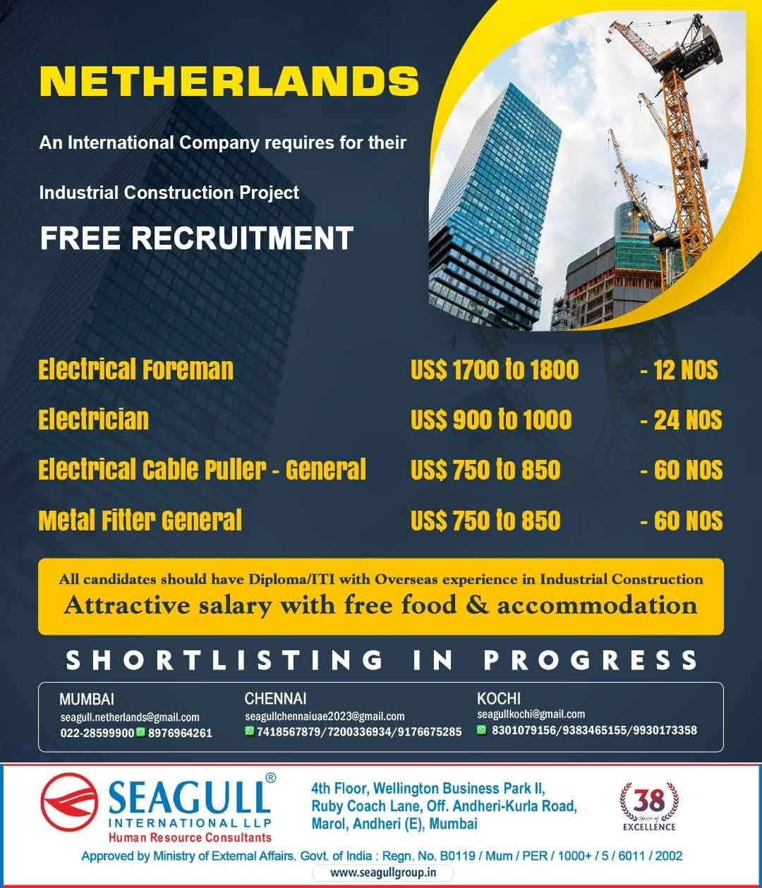 All candidates should have Diploma/ITI with Overseas experience in Industrial Construction