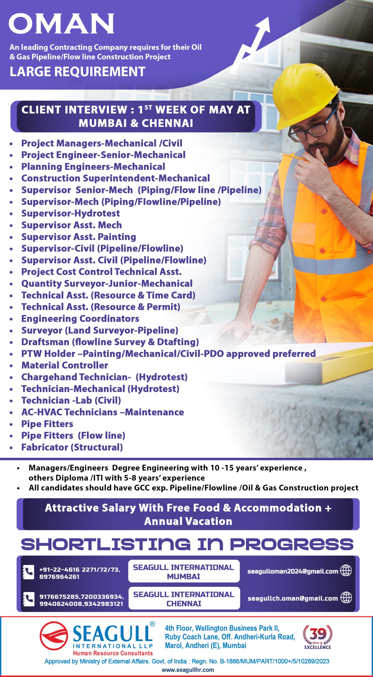 All candidates should have GCC exp. Pipeline/Flowline /Oil & Gas Construction project