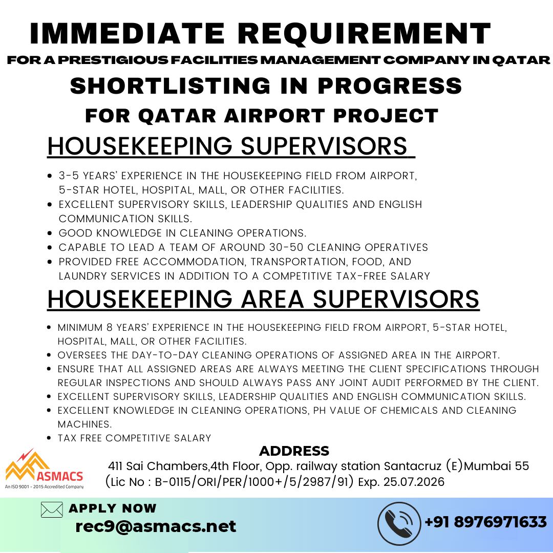 HOUSEKEEPING AREA SUPERVISORS - MINIMUM 8 YEARS’ EXPERIENCE IN THE HOUSEKEEPING FIELD FROM AIRPORT, 5-STAR HOTEL,