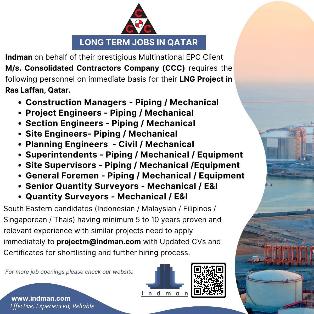 M/s. Consolidated Contractors Company (CCC) requires the following personnel on immediate basis for their LNG Project in Ras Laffan, Qatar.