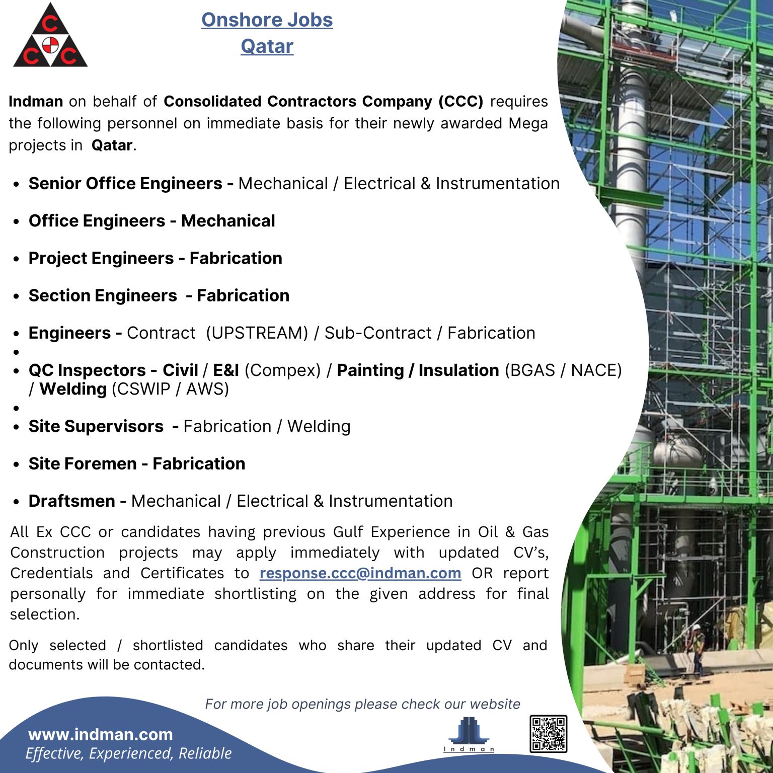 Indman on behalf of Consolidated Contractors Company (CCC) requires the following personnel on immediate basis for their newly awarded Mega projects in Qatar :
