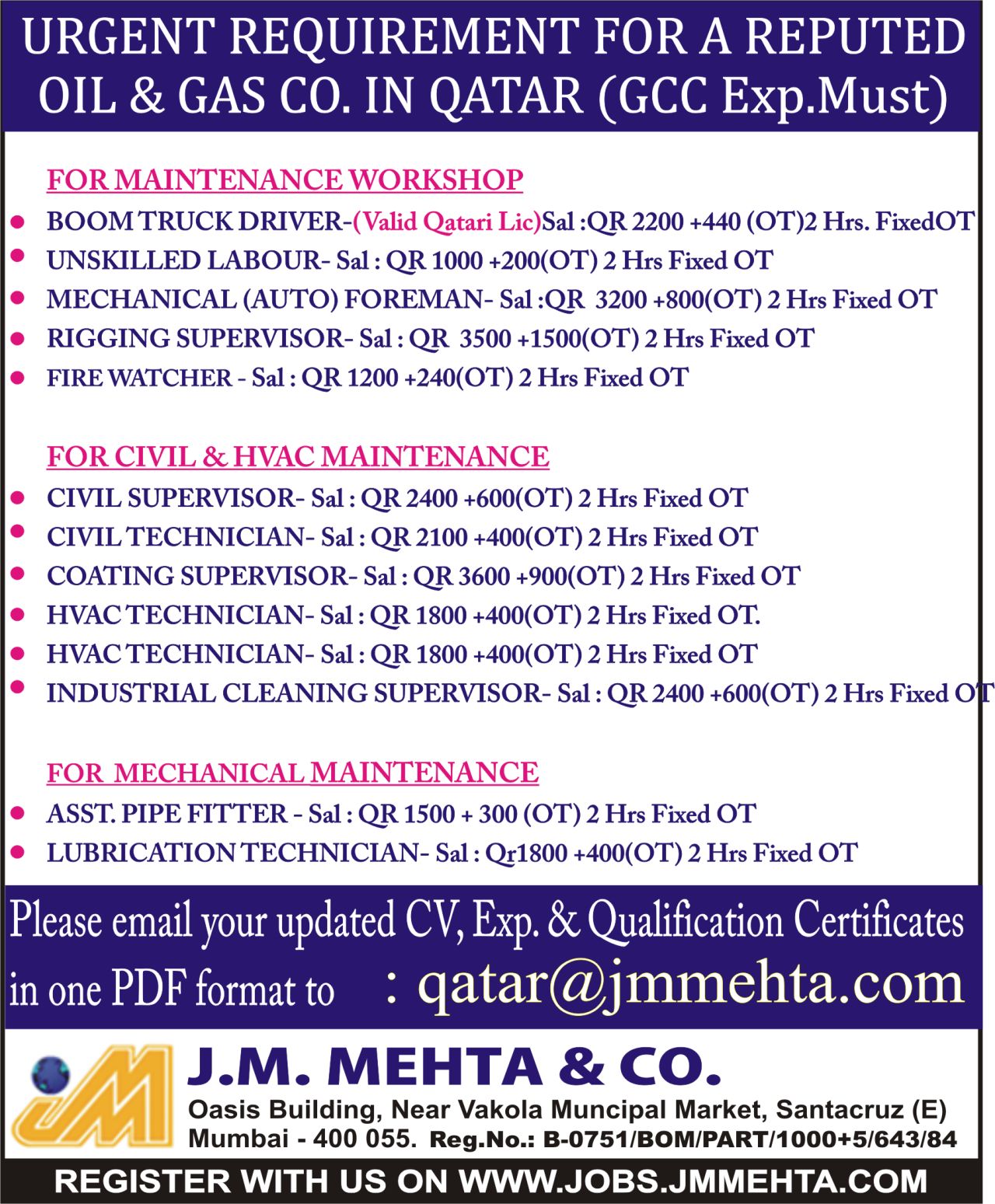 in one PDF format to : qatar@jmmehta.com