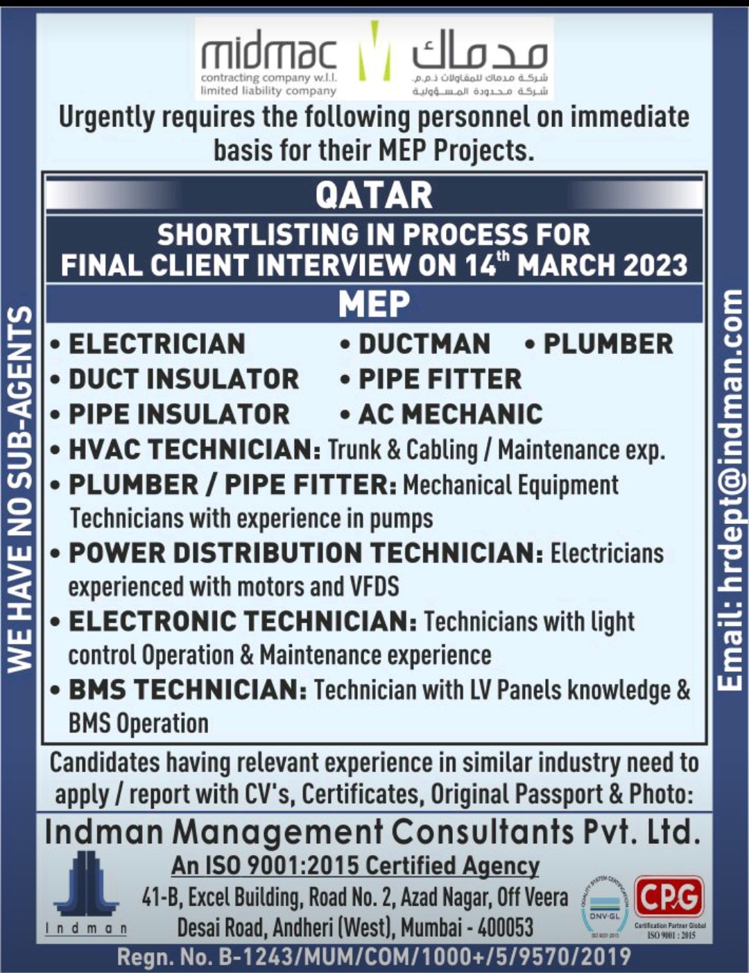 Urgently requires the following personnel on immediate