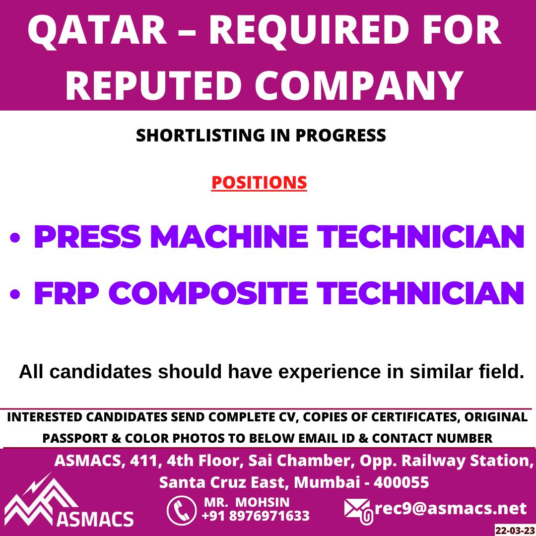 • PRESS MACHINE TECHNICIAN • FRP COMPOSITE TECHNICIAN